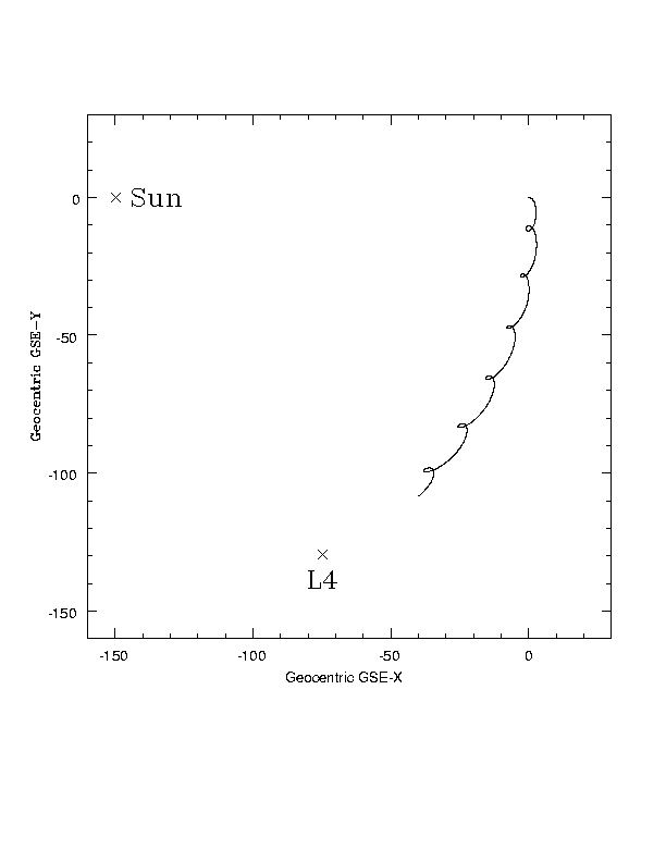 In a rotating frame, centered on the Earth where the Earth-Sun line is kept fixed, SIRTF makes little epicycles and heads towards Earth-Sun L4. Units are millions of km.