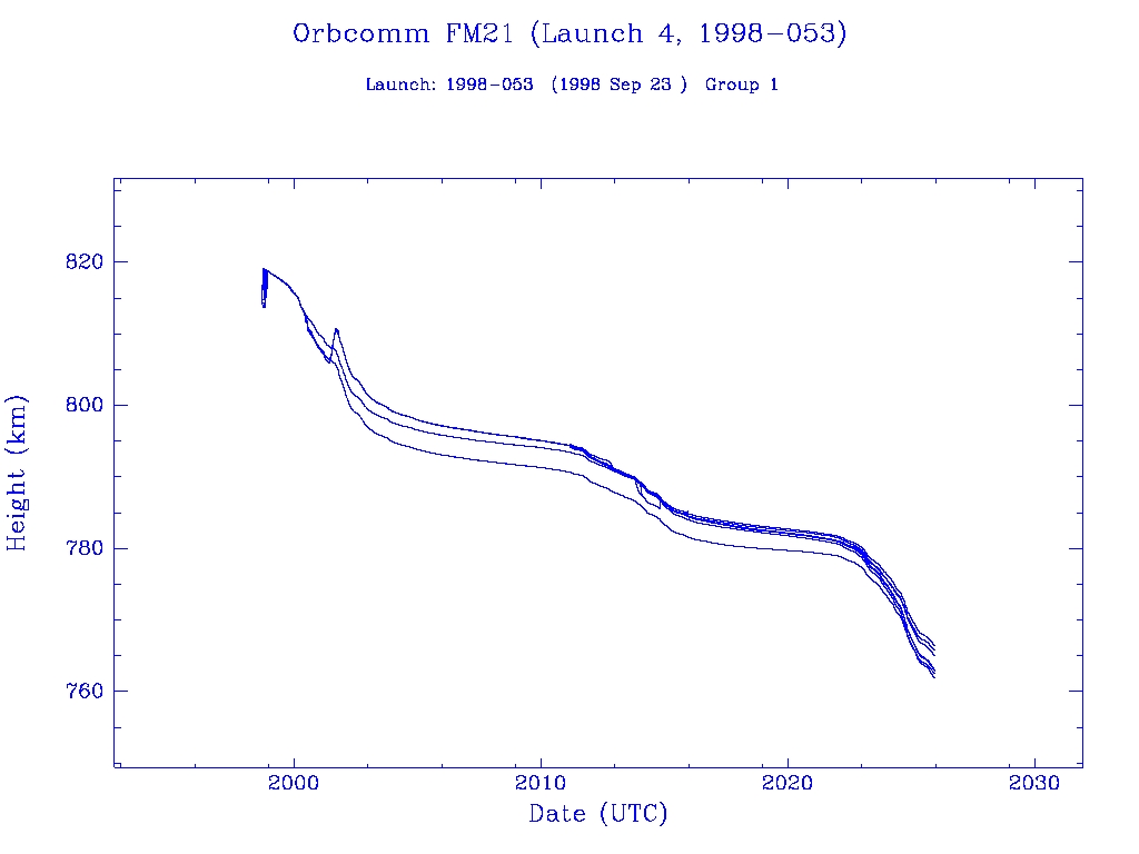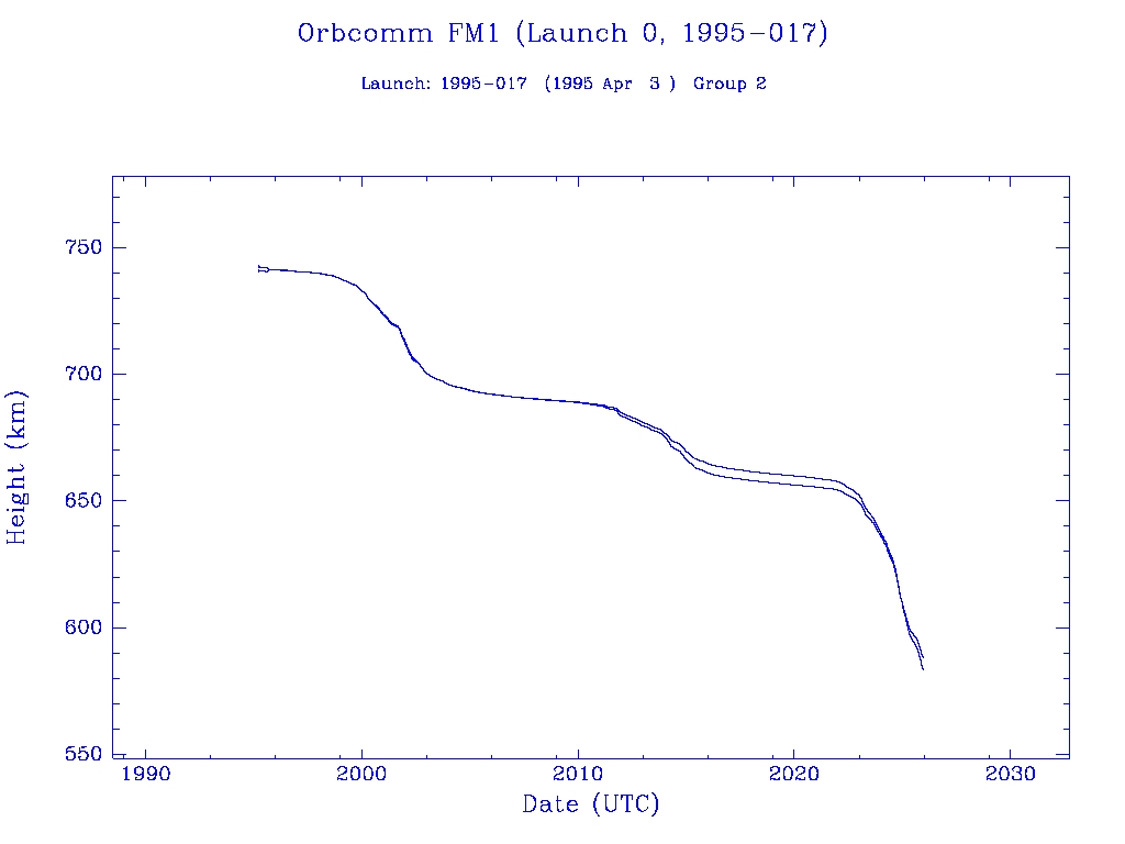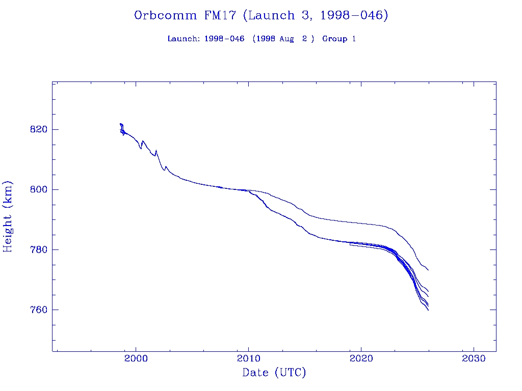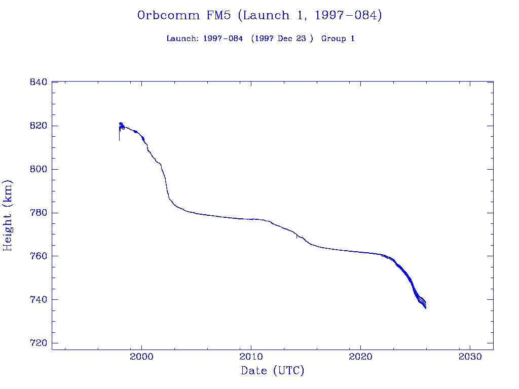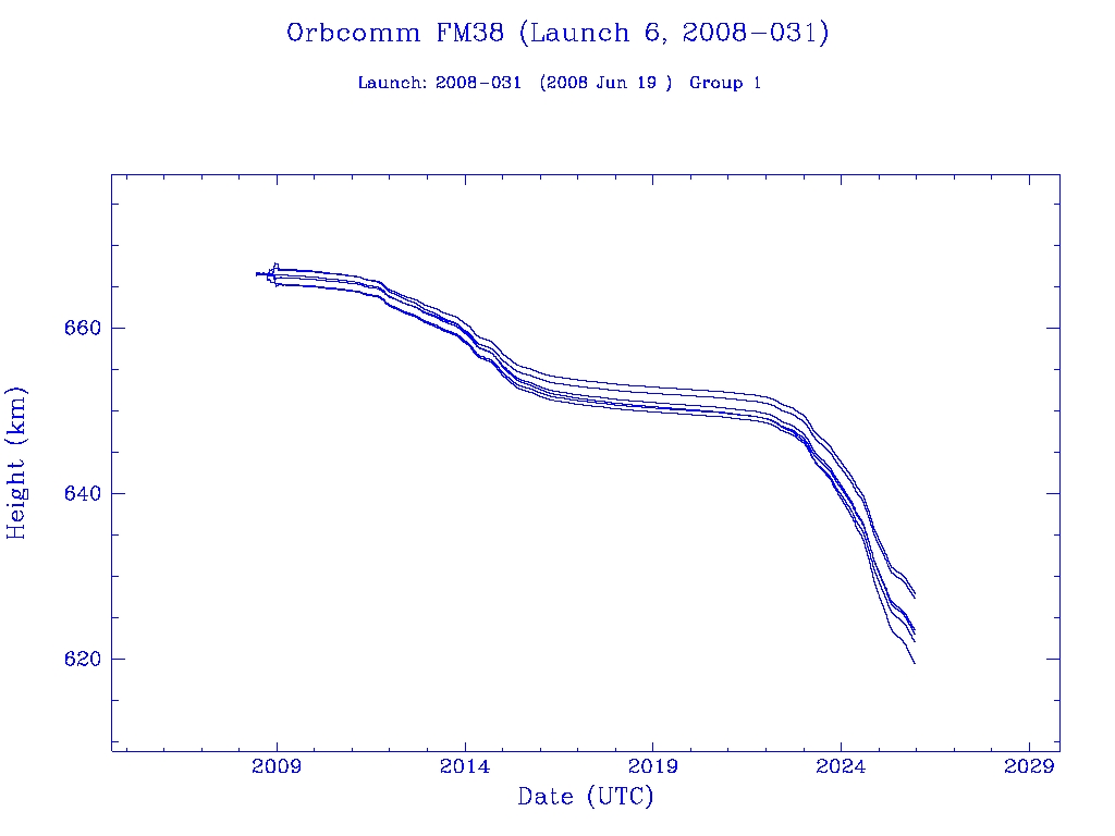 Down (M) Reentry after fail; Later uncontrolled reentry: Reentered after an extended period of uncontrolled orbital decay; presumed failed.