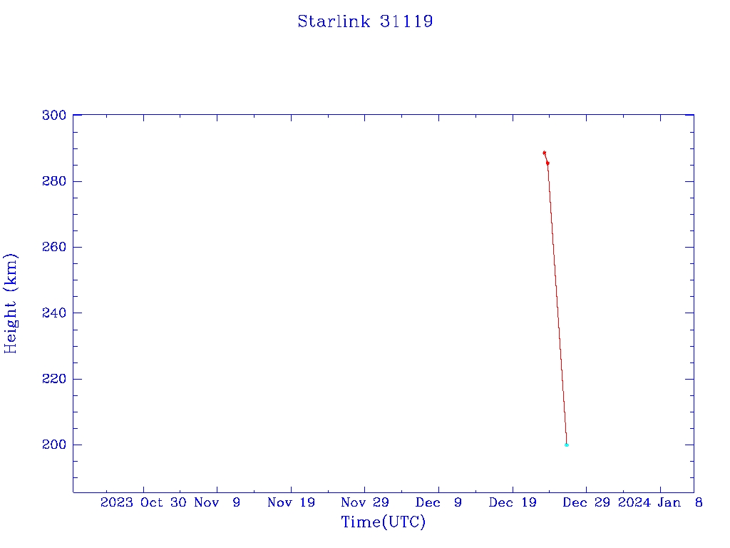 | Starlink 31119 | S58618 | F | 2023 Dec 23 | 2023 Dec 23 | 2023 Dec 26 |  |  |  |