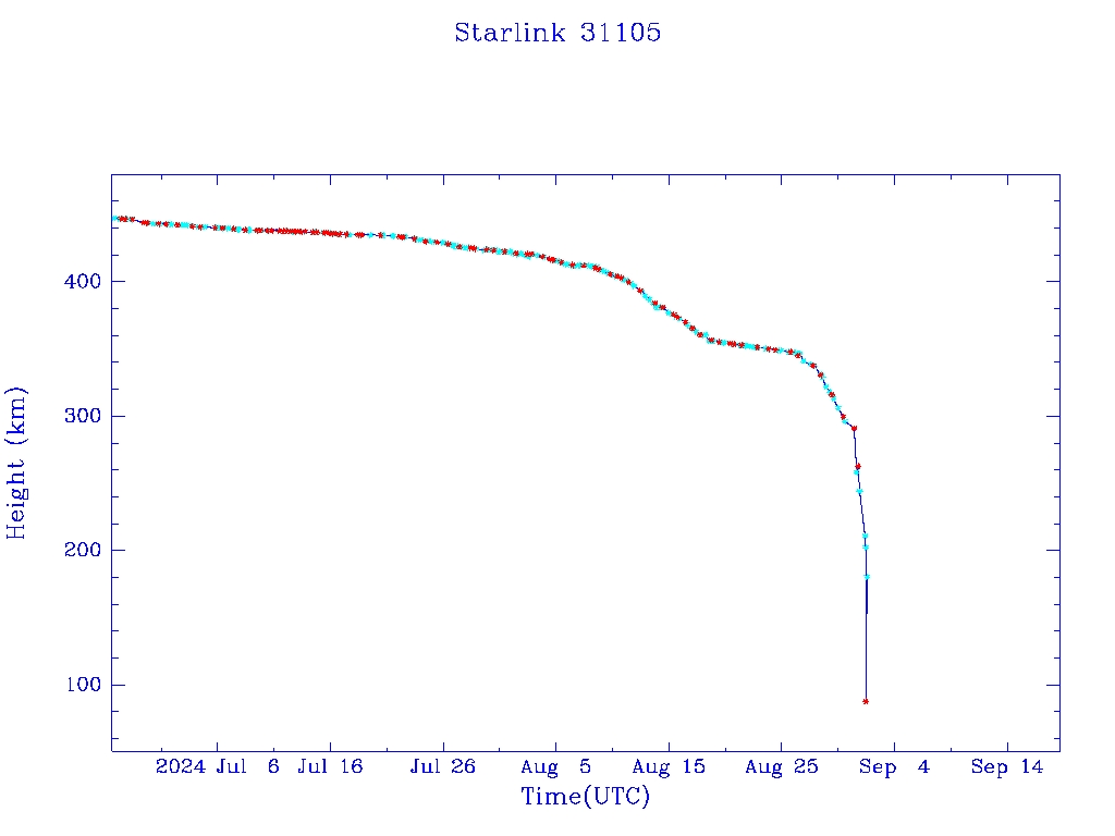 | Starlink 31105 | S58805 | R | 2024 Jan 15 | 2024 Aug 31 | 2024 Sep 1 |  |  |  |