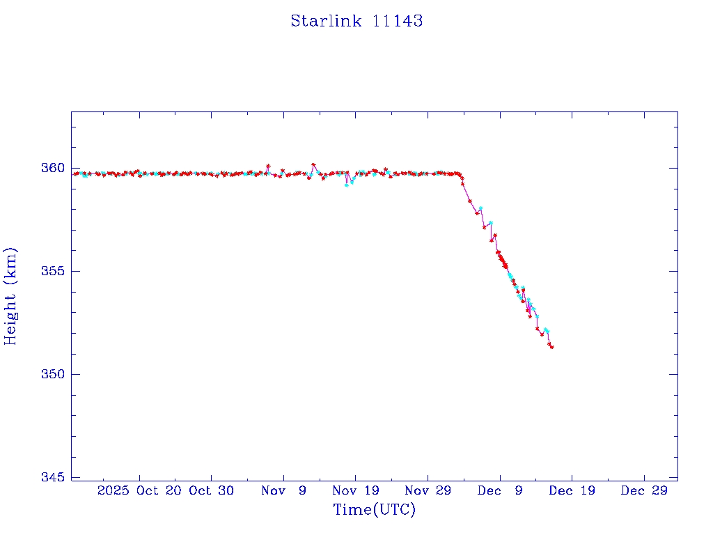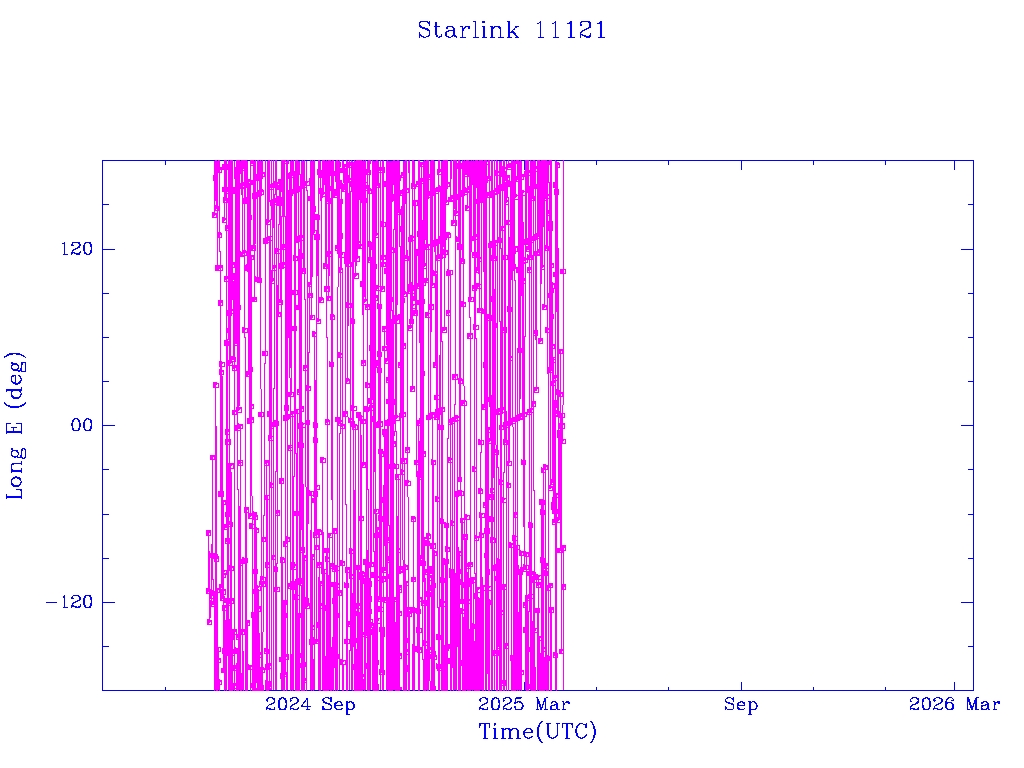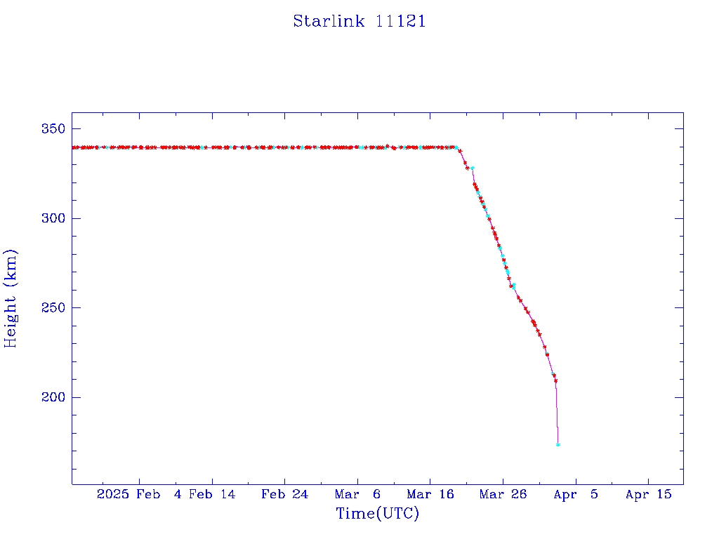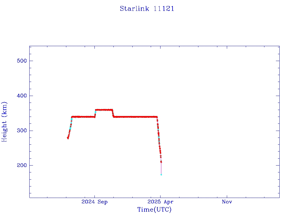 | Starlink 11121 | S59946 | R | 2024 Jun 5 | 2025 Apr 1? | 2025 Apr 2 |  |  |  |