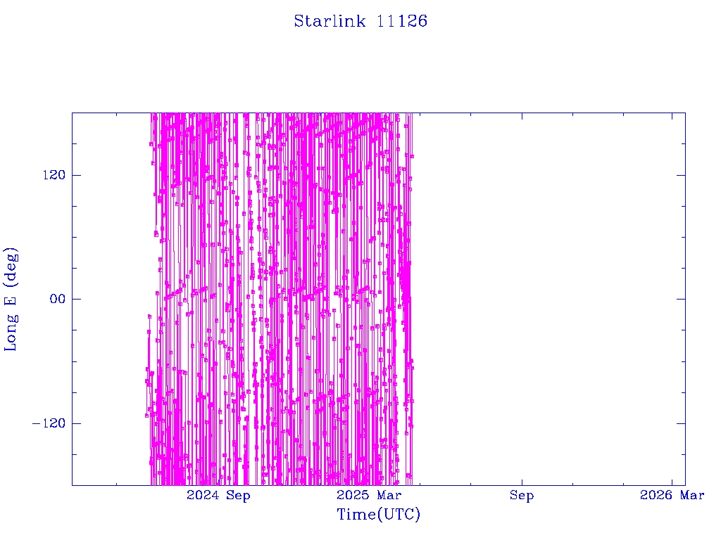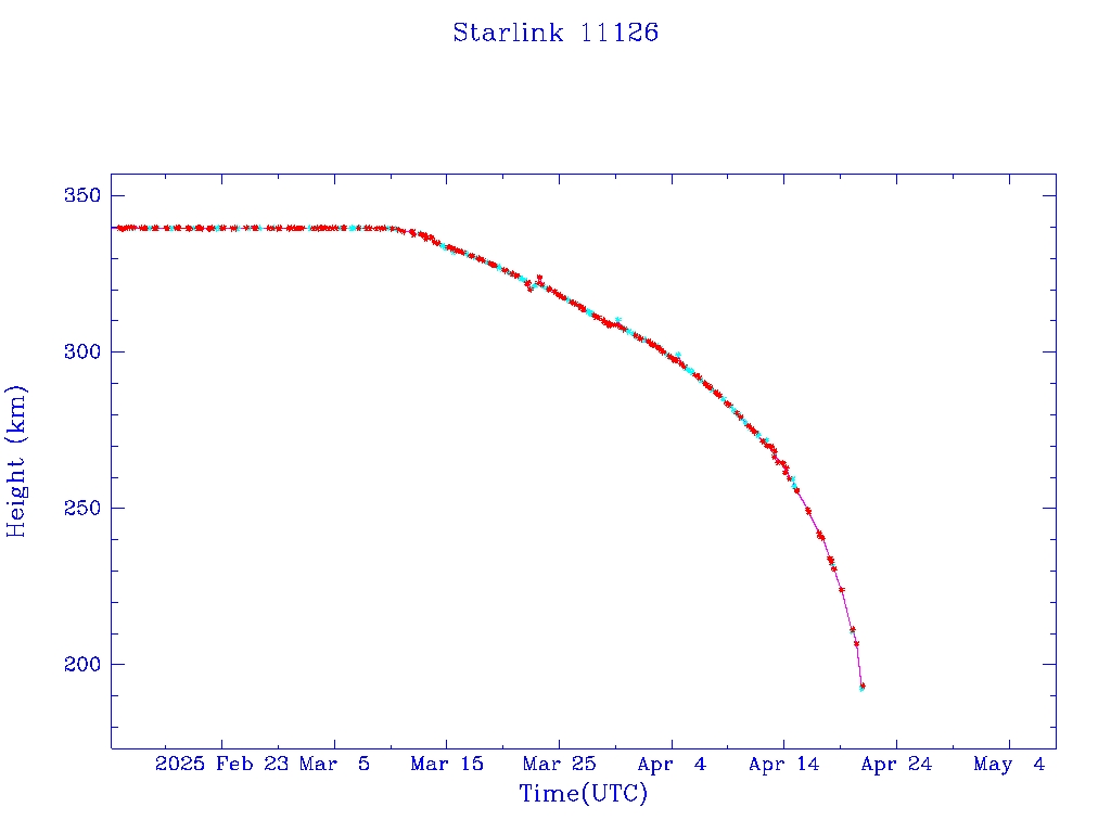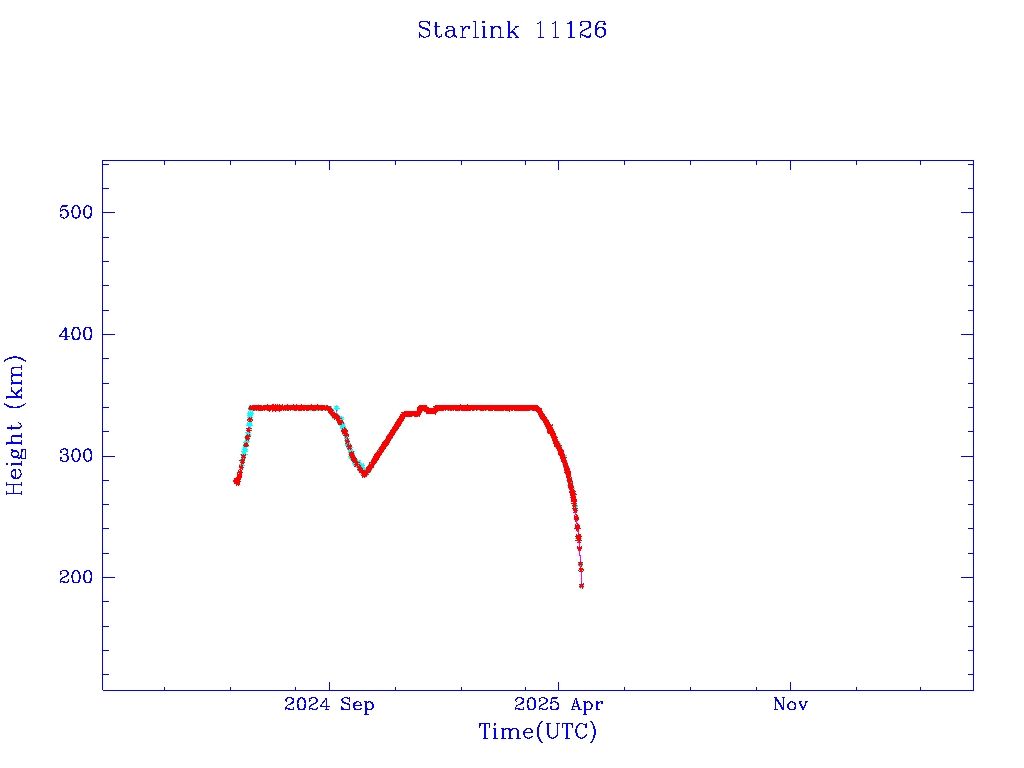 | Starlink 11126 | S59951 | R | 2024 Jun 5 | 2025 Apr 4? | 2025 Apr 21 |  |  |  |