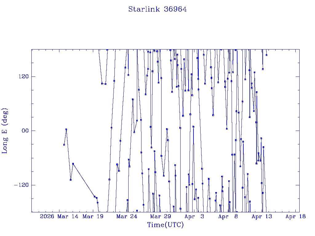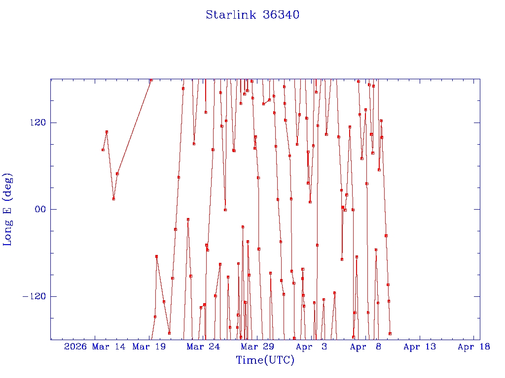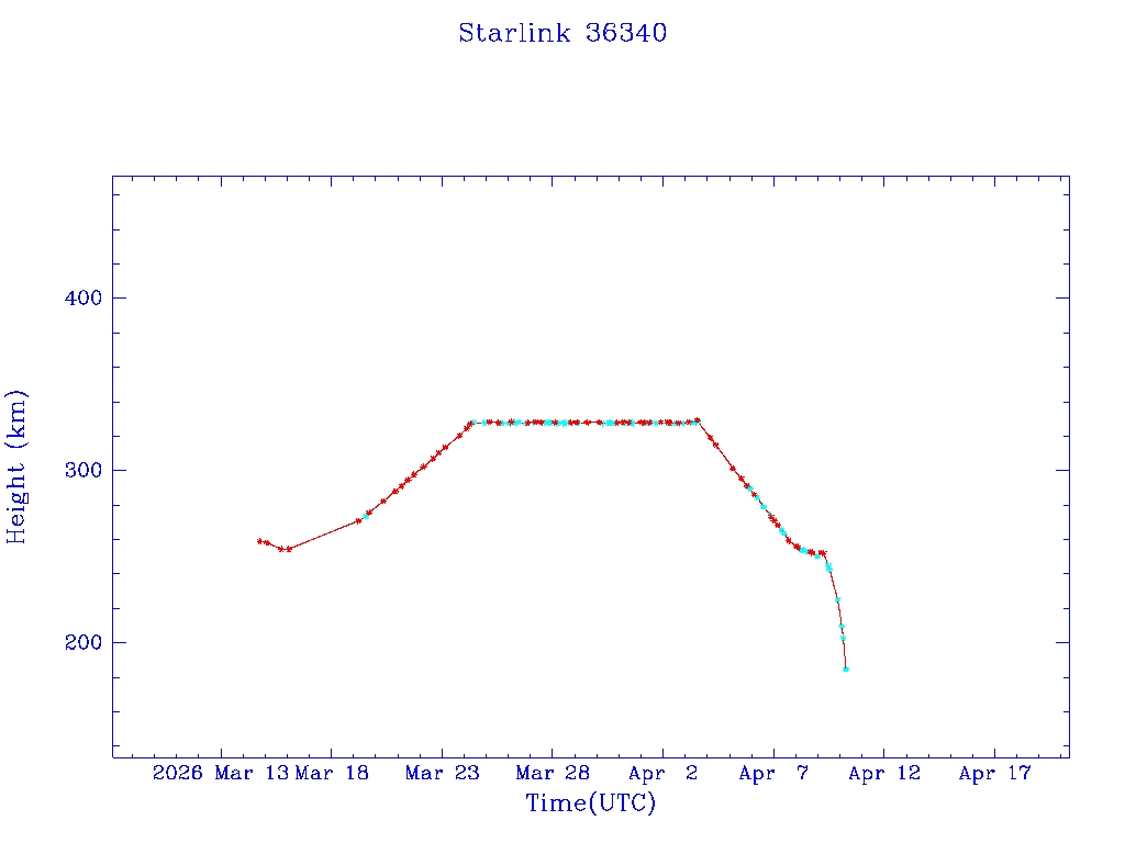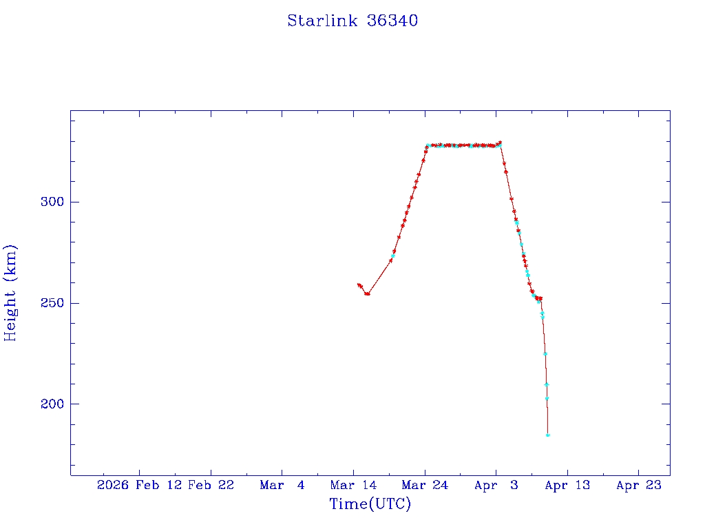 | Starlink 36340 | S68188 | F | 2026 Mar 14 | 2026 Apr 9 | 2026 Apr 10 |  |  |  |