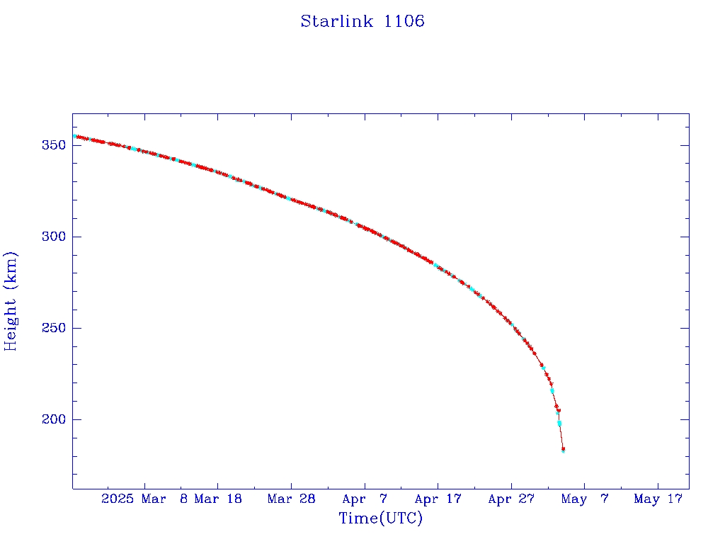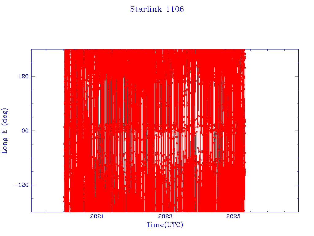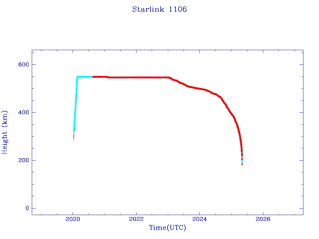 | Starlink 1106 | S44923 | M | 2020 Jan 7 | 2023 Jan 10? | 2025 May 4 |  |  |  |