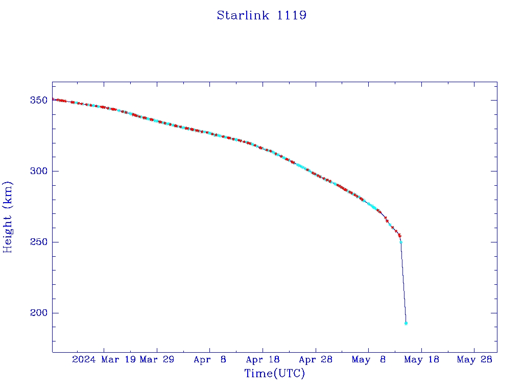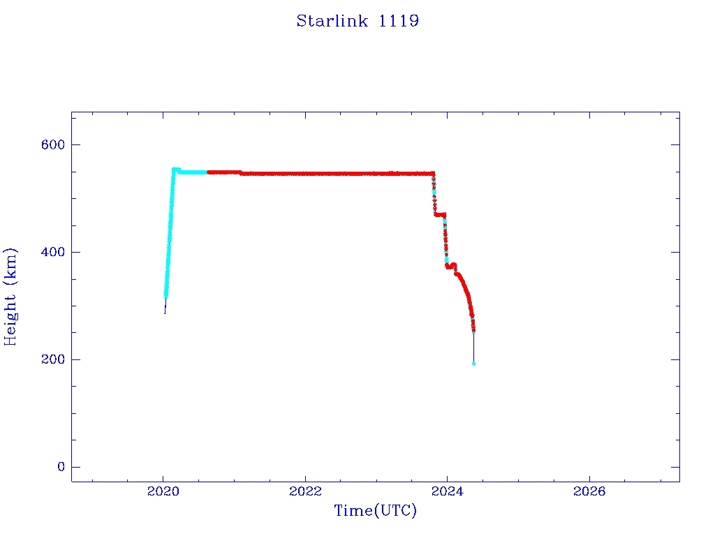 | Starlink 1119 | S44928 | R | 2020 Jan 7 | 2024 May 13 | 2024 May 15 |  |  |  |