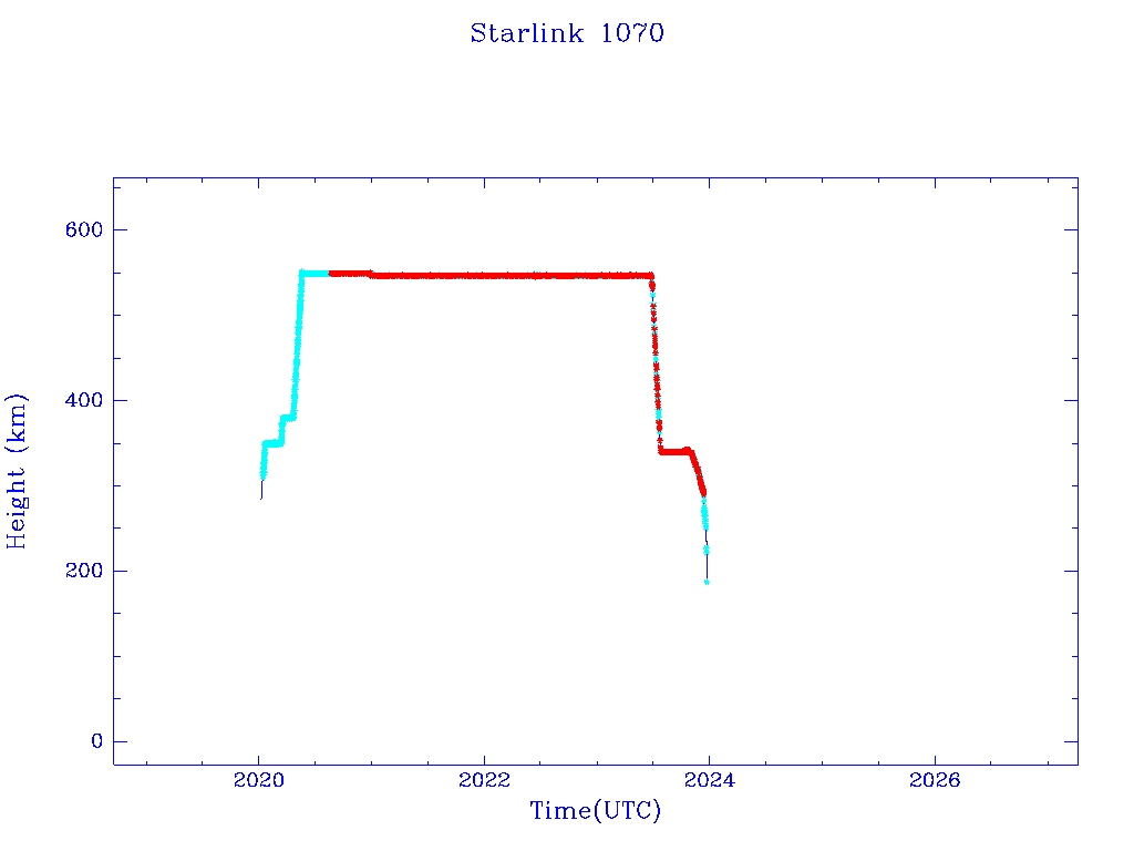 | Starlink 1070 | S44956 | R | 2020 Jan 7 | 2023 Dec 14? | 2023 Dec 22 |  |  |  |