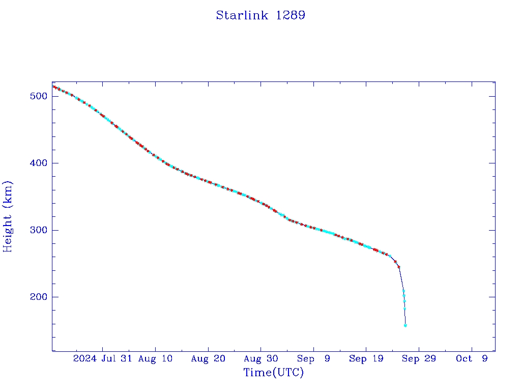 | Starlink 1289 | S45391 | R | 2020 Mar 18 | 2024 Sep 23? | 2024 Sep 26 |  |  |  |