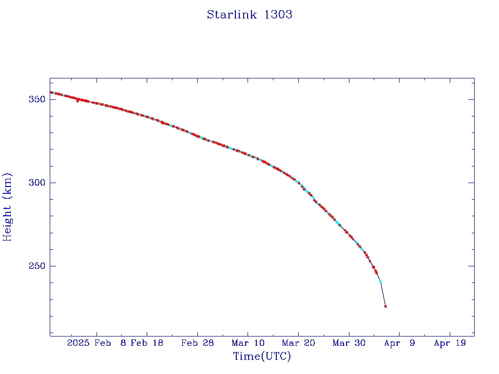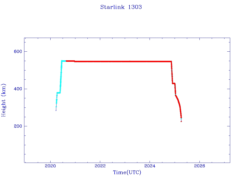 | Starlink 1303 | S45396 | R | 2020 Mar 18 | 2025 Jan 11? | 2025 Apr 6 |  |  |  |