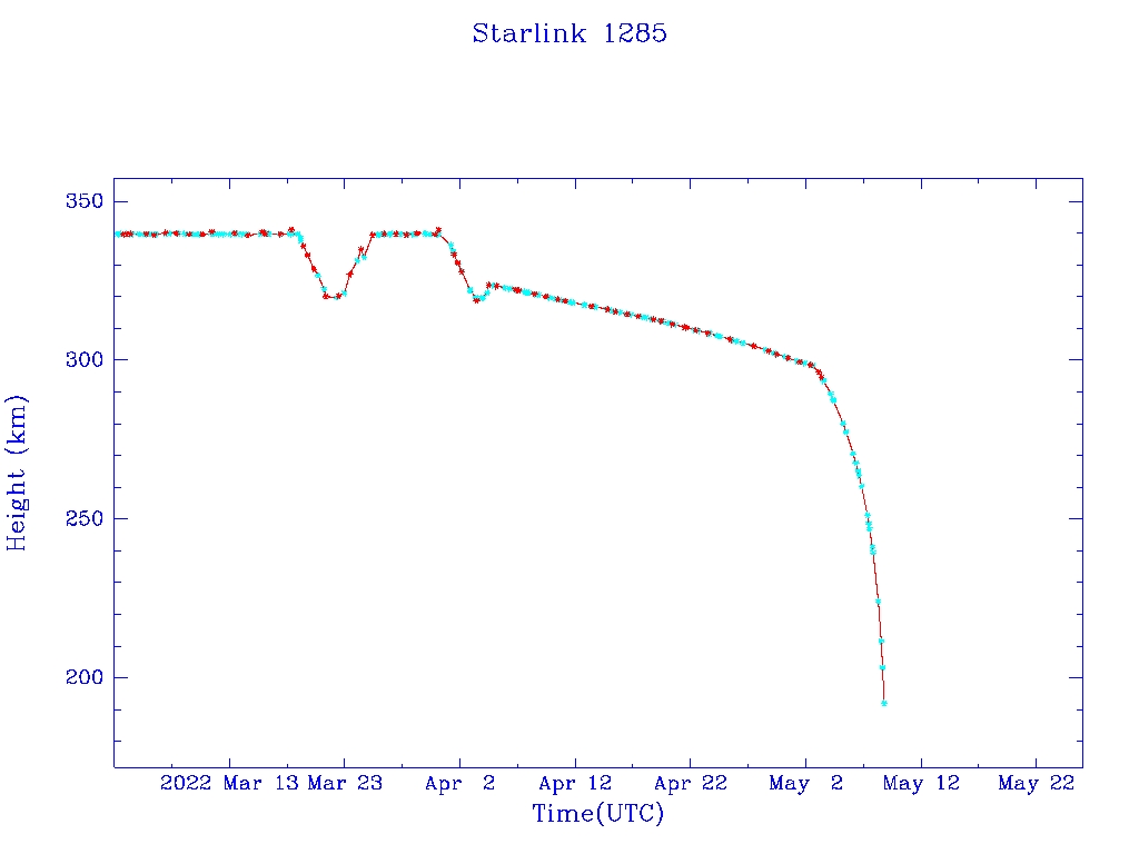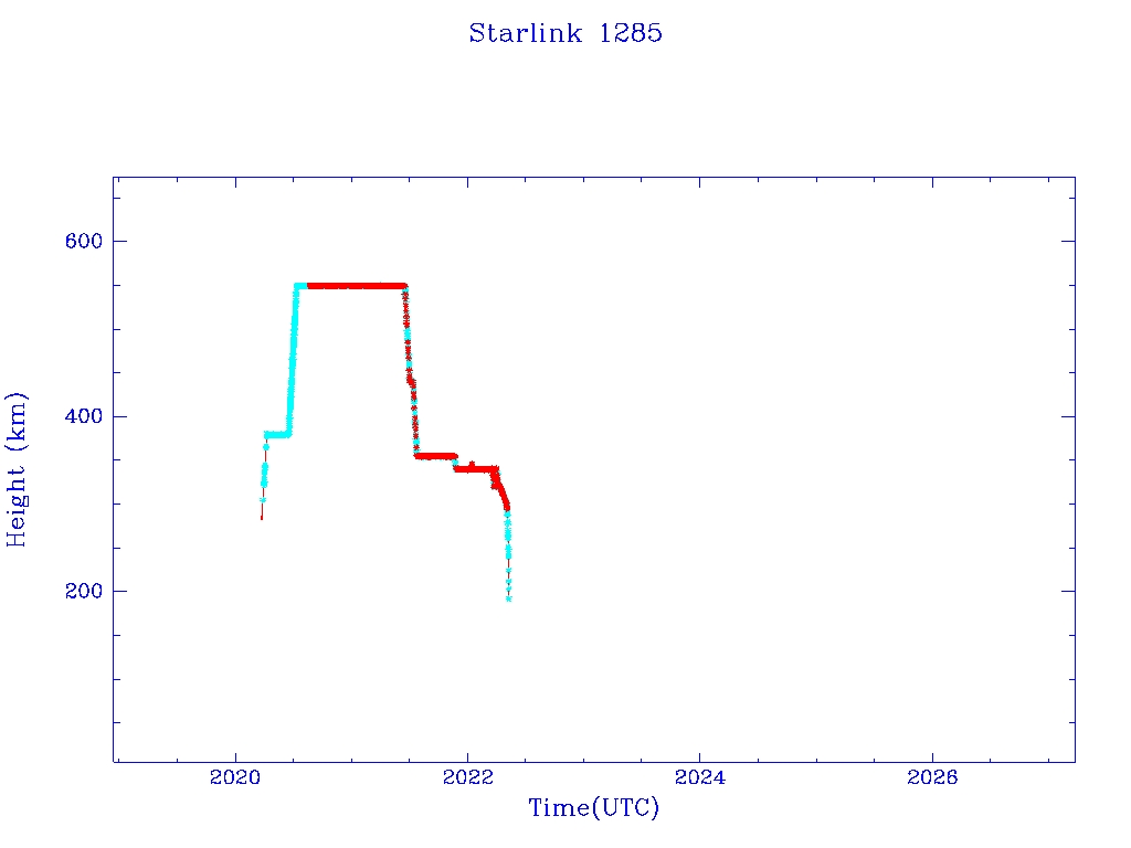 | Starlink 1285 | S45410 | R | 2020 Mar 18 | 2022 May 2 | 2022 May 9 |  |  |  |