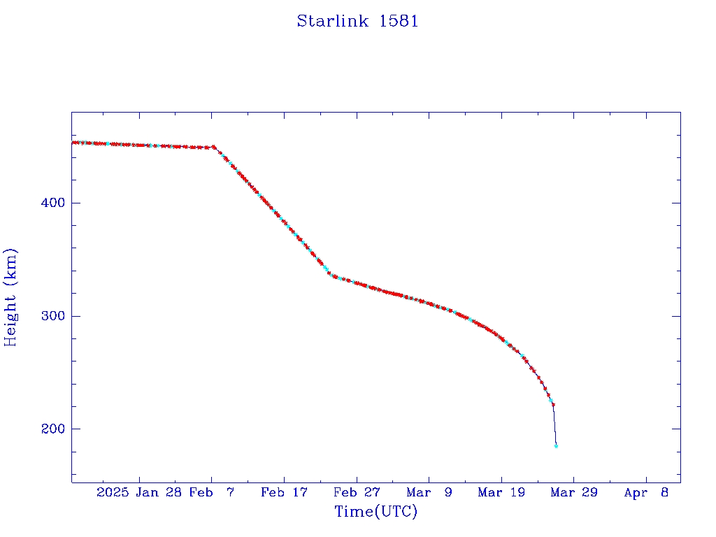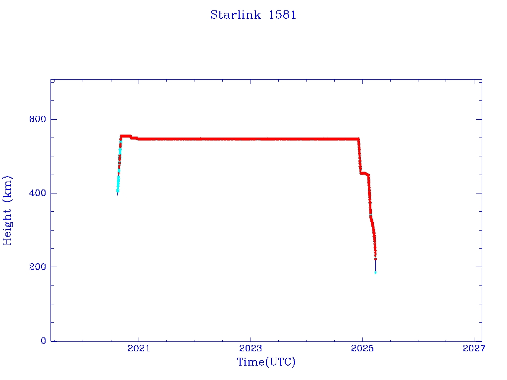 | Starlink 1581 | S46042 | R | 2020 Aug 7 | 2025 Feb 23 | 2025 Mar 26 |  |  |  |