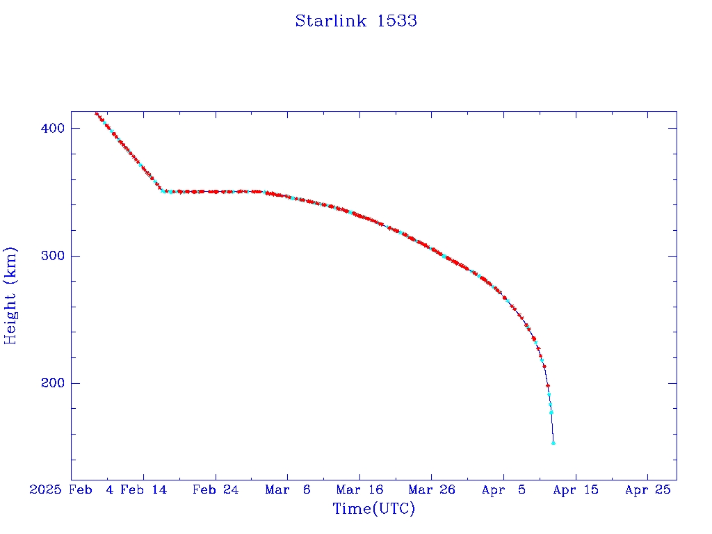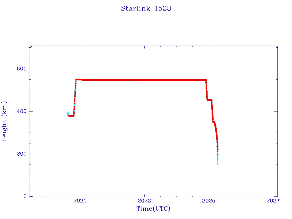 | Starlink 1533 | S46069 | R | 2020 Aug 7 | 2025 Mar 2? | 2025 Apr 12 |  |  |  |