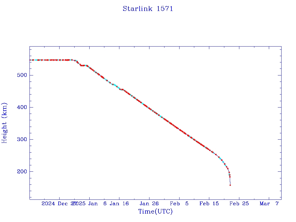 | Starlink 1571 | S46081 | R | 2020 Aug 7 | 2025 Feb 17? | 2025 Feb 22 |  |  |  |