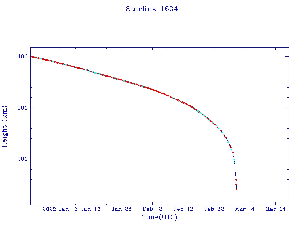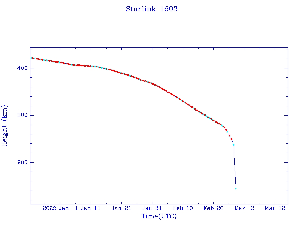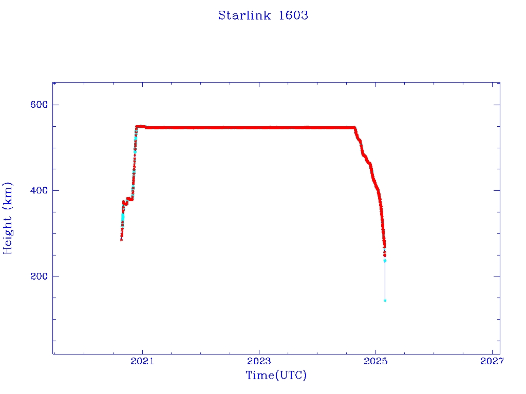 | Starlink 1603 | S46162 | R | 2020 Aug 18 | 2025 Feb 23? | 2025 Feb 27 |  |  |  |