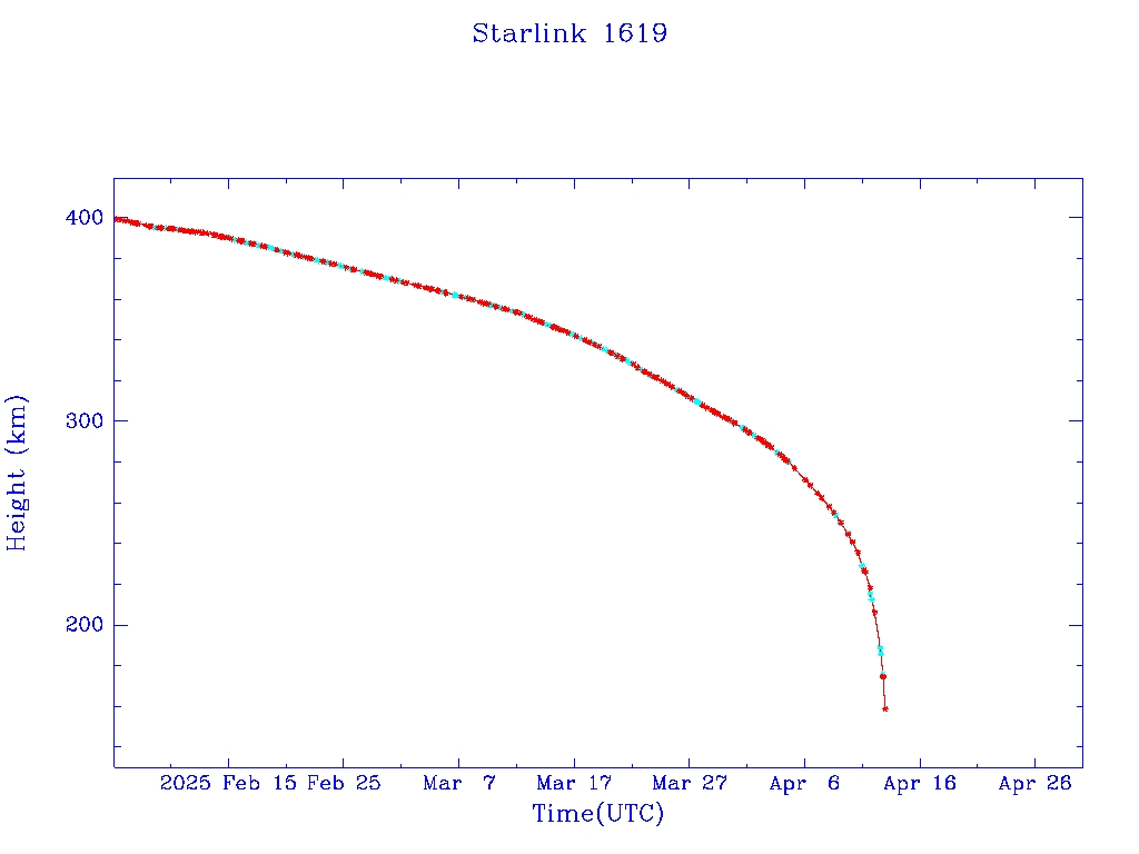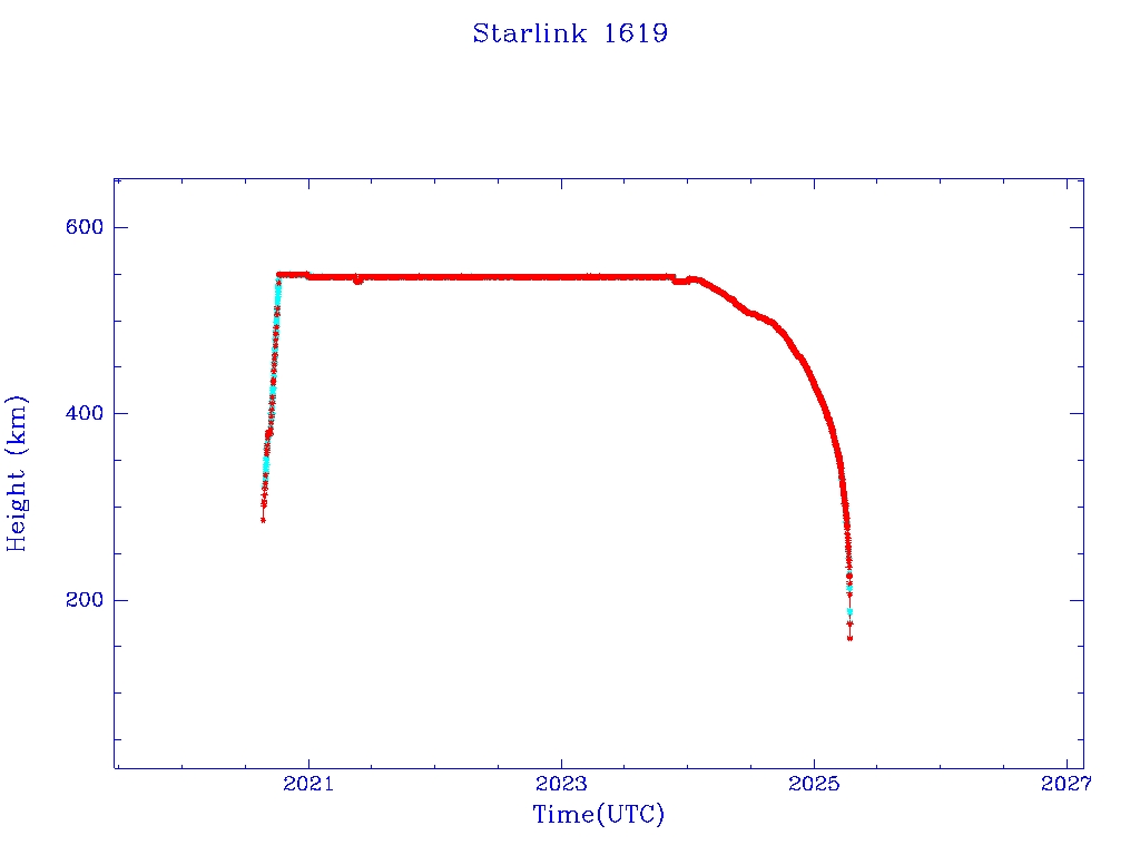 | Starlink 1619 | S46126 | M | 2020 Aug 18 | 2024 Jan 4 | 2025 Apr 13 |  |  |  |