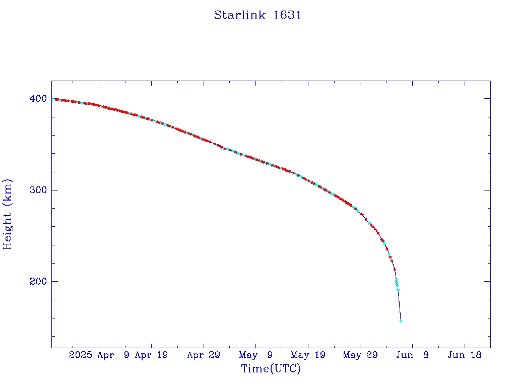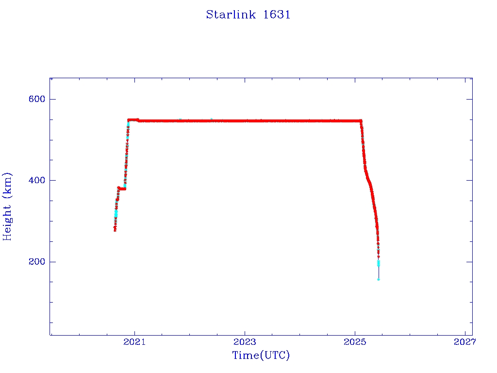 | Starlink 1631 | S46151 | R | 2020 Aug 18 | 2025 Apr 6? | 2025 Jun 5 |  |  |  |