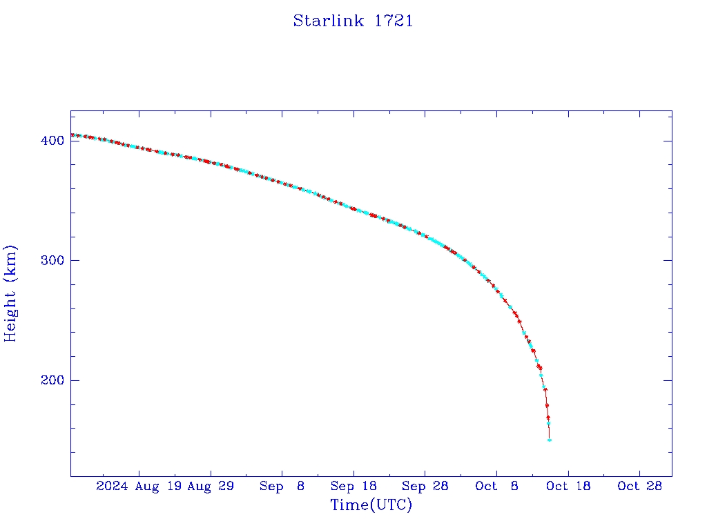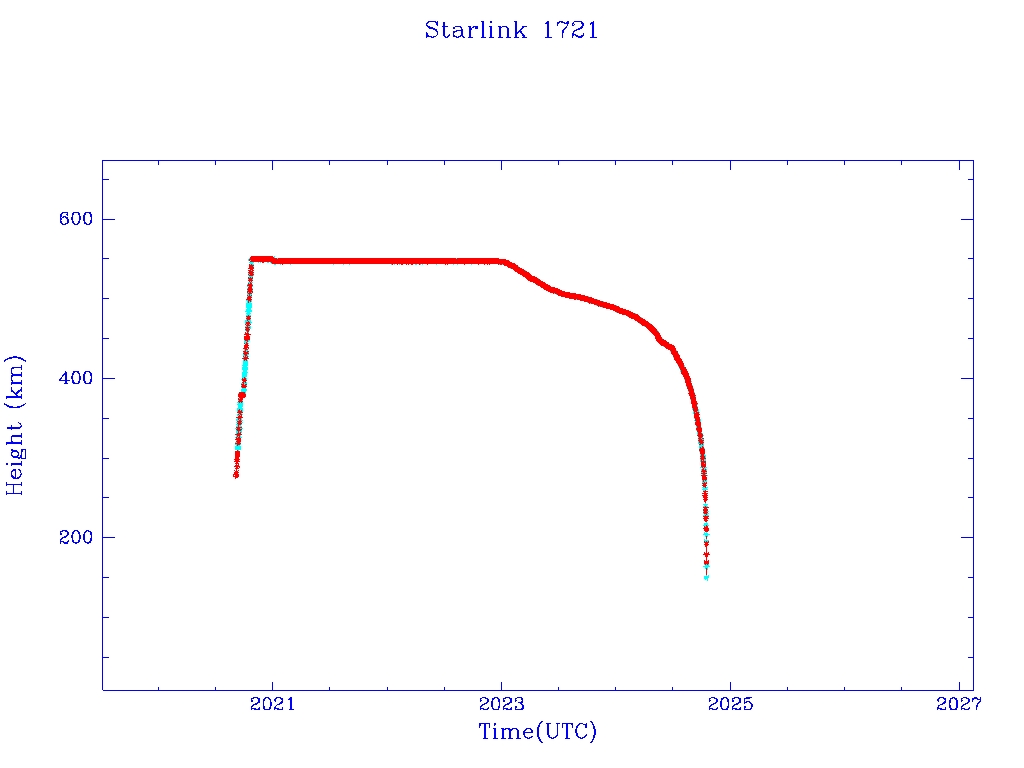 | Starlink 1721 | S46332 | M | 2020 Sep 3 | 2022 Dec 29 | 2024 Oct 15 |  |  |  |