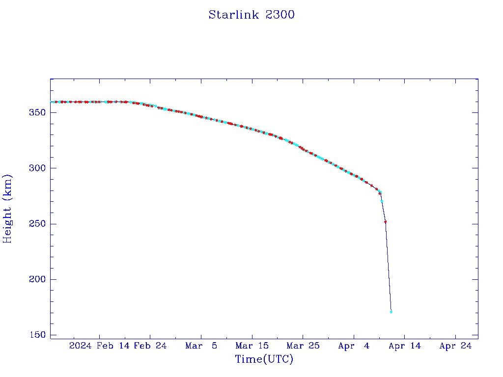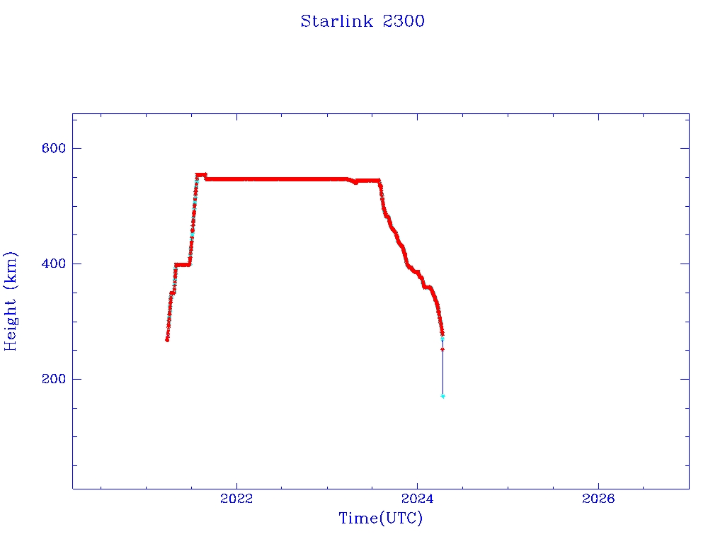 | Starlink 2300 | S48027 | R | 2021 Mar 24 | 2024 Apr 9 | 2024 Apr 11 |  |  |  |