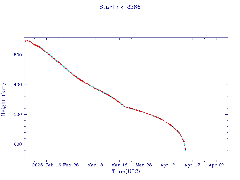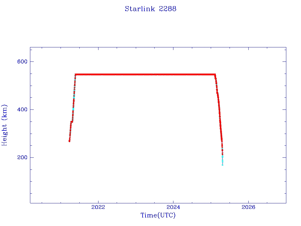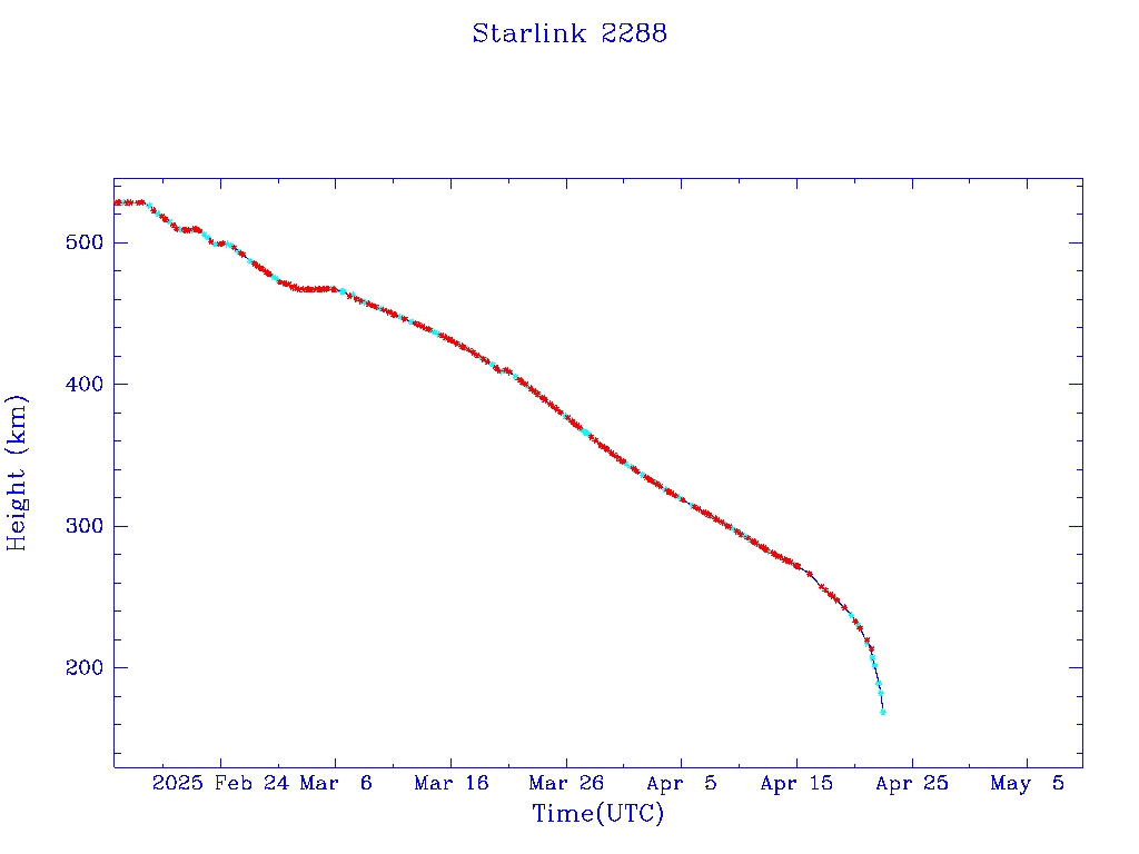 | Starlink 2288 | S48034 | R | 2021 Mar 24 | 2025 Apr 15? | 2025 Apr 22 |  |  |  |