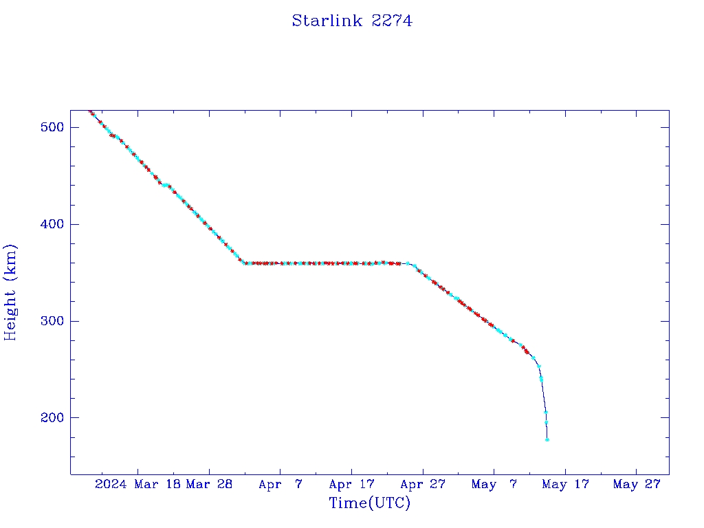 | Starlink 2274 | S48599 | R | 2021 May 15 | 2024 May 11? | 2024 May 14 |  |  |  |
