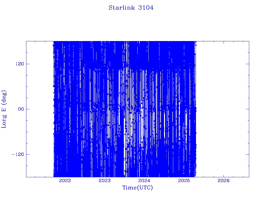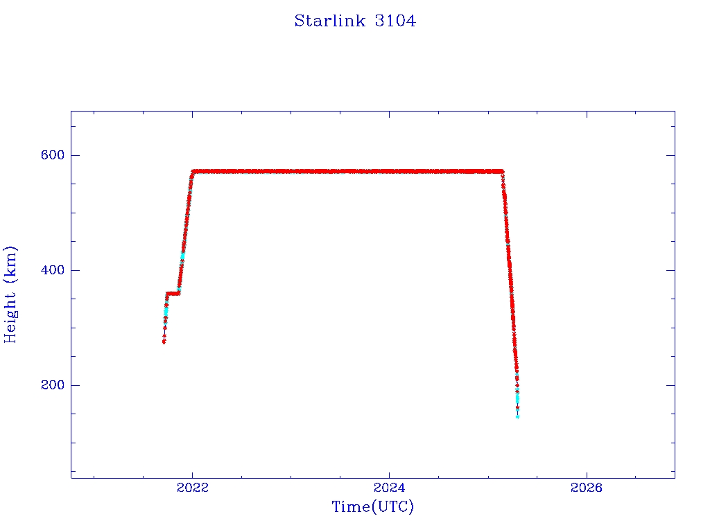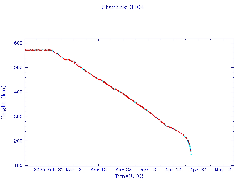 | Starlink 3104 | S49150 | R | 2021 Sep 14 | 2025 Apr 8? | 2025 Apr 19 |  |  |  |