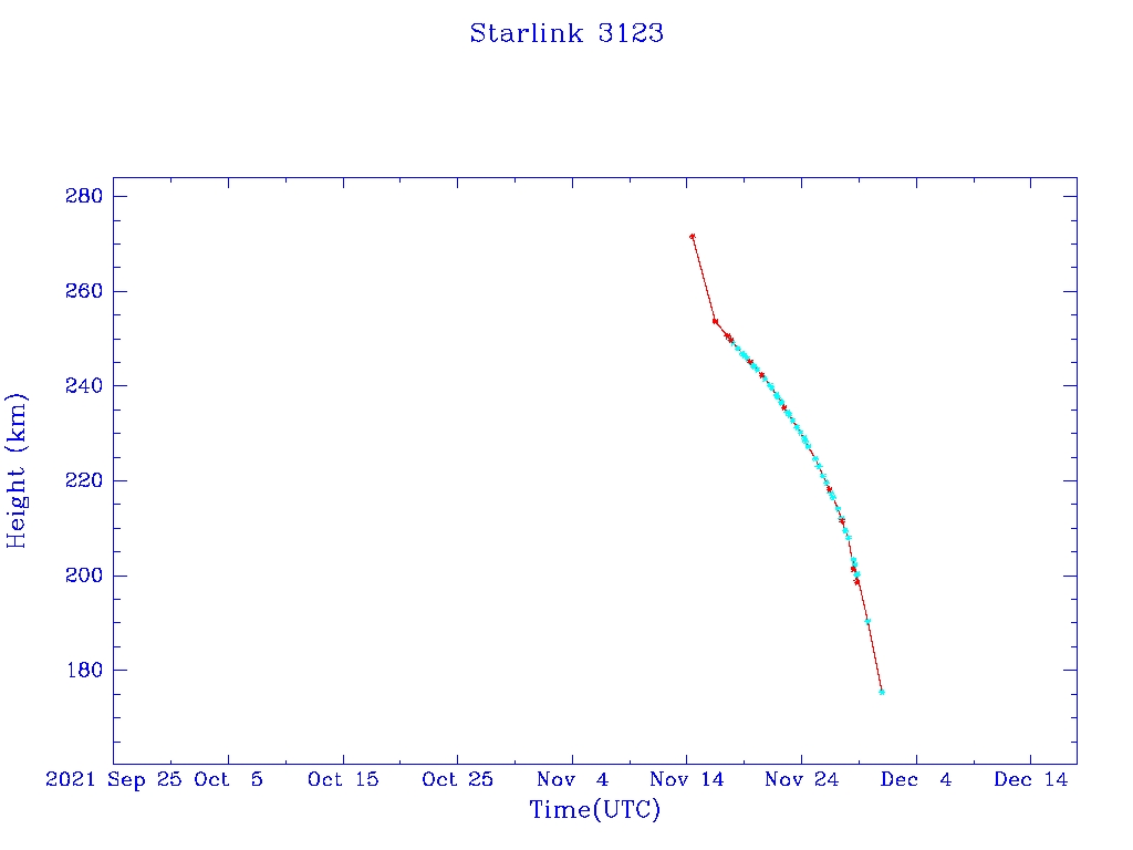 | Starlink 3123 | S49429 | F | 2021 Nov 13 | 2021 Nov 14? | 2021 Dec 1 |  |  |  |