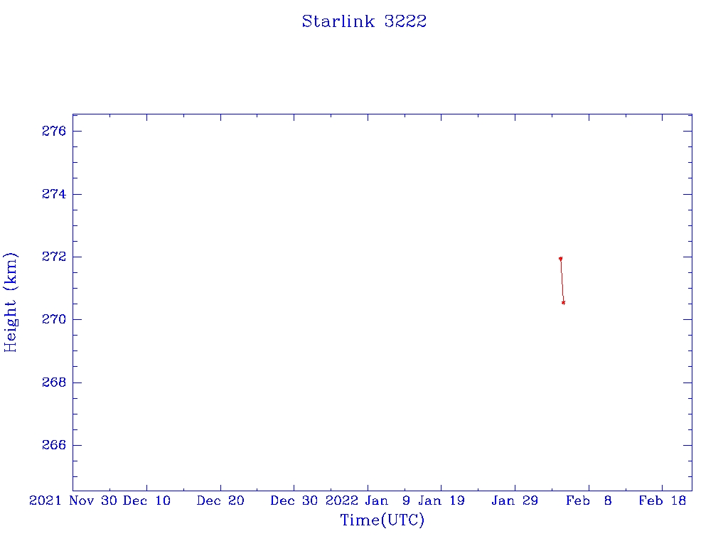 | Starlink 3222 | A10837 | F | 2022 Feb 3 | 2022 Feb 4? | 2022 Feb 5? |  |  |  |