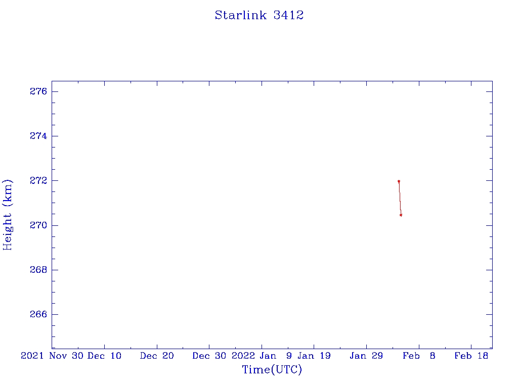 | Starlink 3412 | A10840 | F | 2022 Feb 3 | 2022 Feb 4? | 2022 Feb 5? |  |  |  |