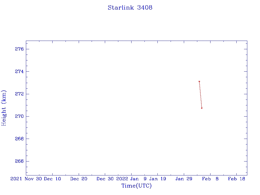 | Starlink 3408 | A10843 | F | 2022 Feb 3 | 2022 Feb 4? | 2022 Feb 5? |  |  |  |