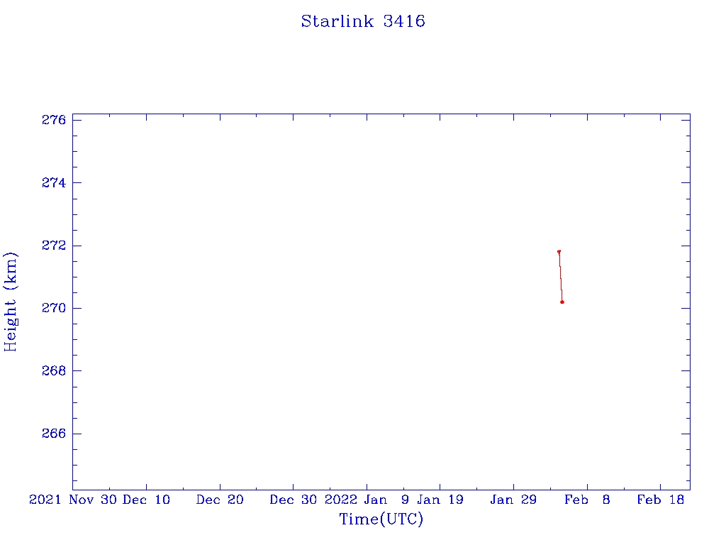 | Starlink 3416 | A10851 | F | 2022 Feb 3 | 2022 Feb 4? | 2022 Feb 5? |  |  |  |