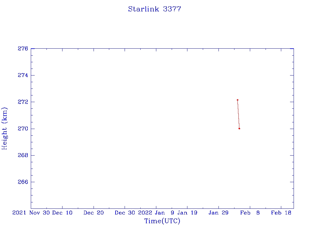 | Starlink 3377 | A10859 | F | 2022 Feb 3 | 2022 Feb 4? | 2022 Feb 5? |  |  |  |