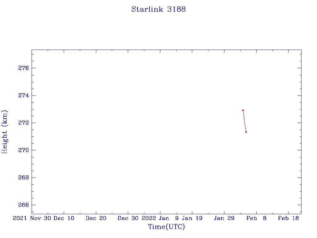 | Starlink 3188 | A10861 | F | 2022 Feb 3 | 2022 Feb 4? | 2022 Feb 5? |  |  |  |