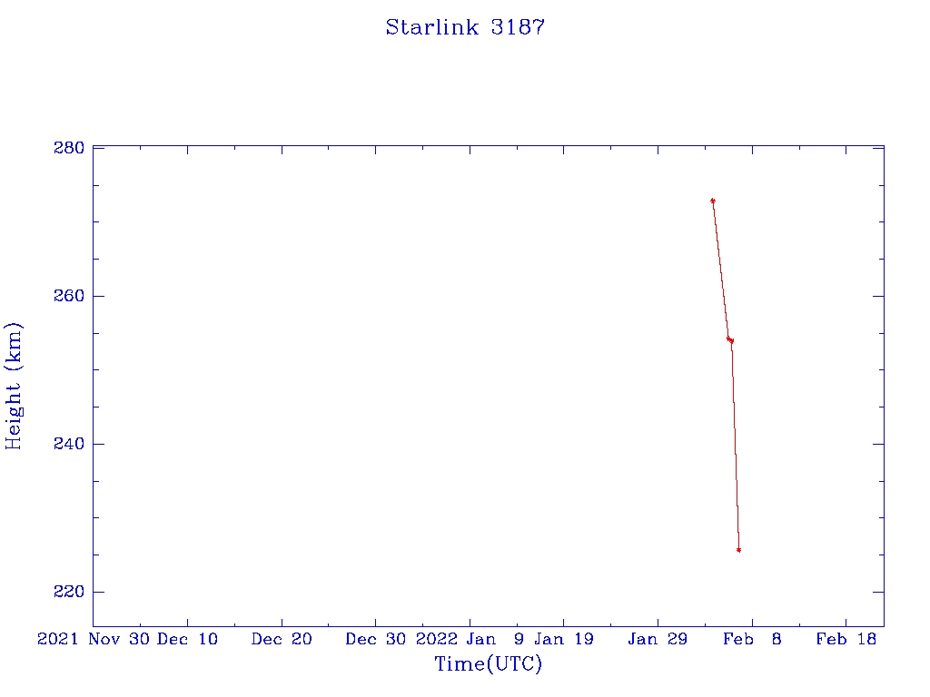 | Starlink 3187 | A10864 | F | 2022 Feb 3 | 2022 Feb 4? | 2022 Feb 5? |  |  |  |