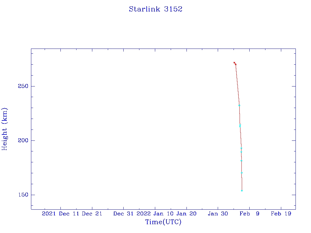 | Starlink 3152 | S51456 | F | 2022 Feb 3 | 2022 Feb 5? | 2022 Feb 6 |  |  |  |