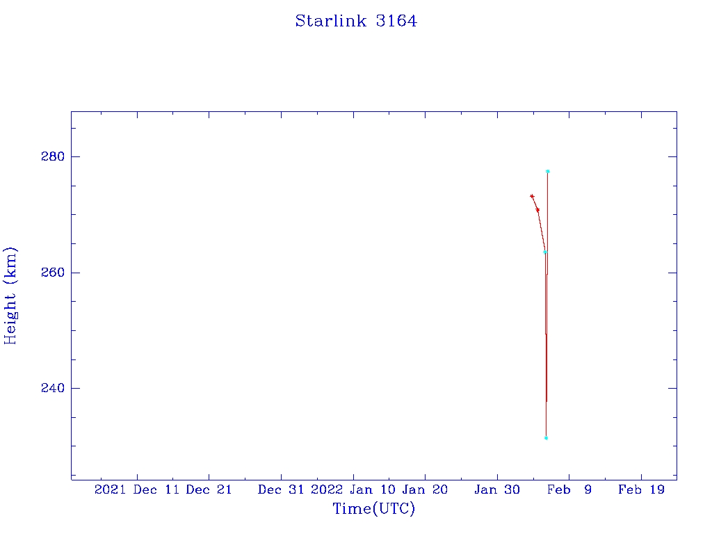 | Starlink 3164 | S51458 | F | 2022 Feb 3 | 2022 Feb 5? | 2022 Feb 6 |  |  |  |
