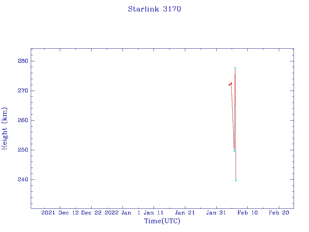 | Starlink 3170 | S51459 | F | 2022 Feb 3 | 2022 Feb 5? | 2022 Feb 7 |  |  |  |