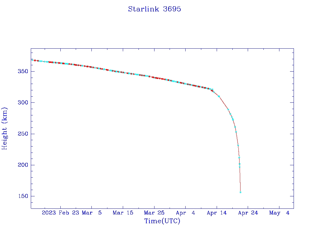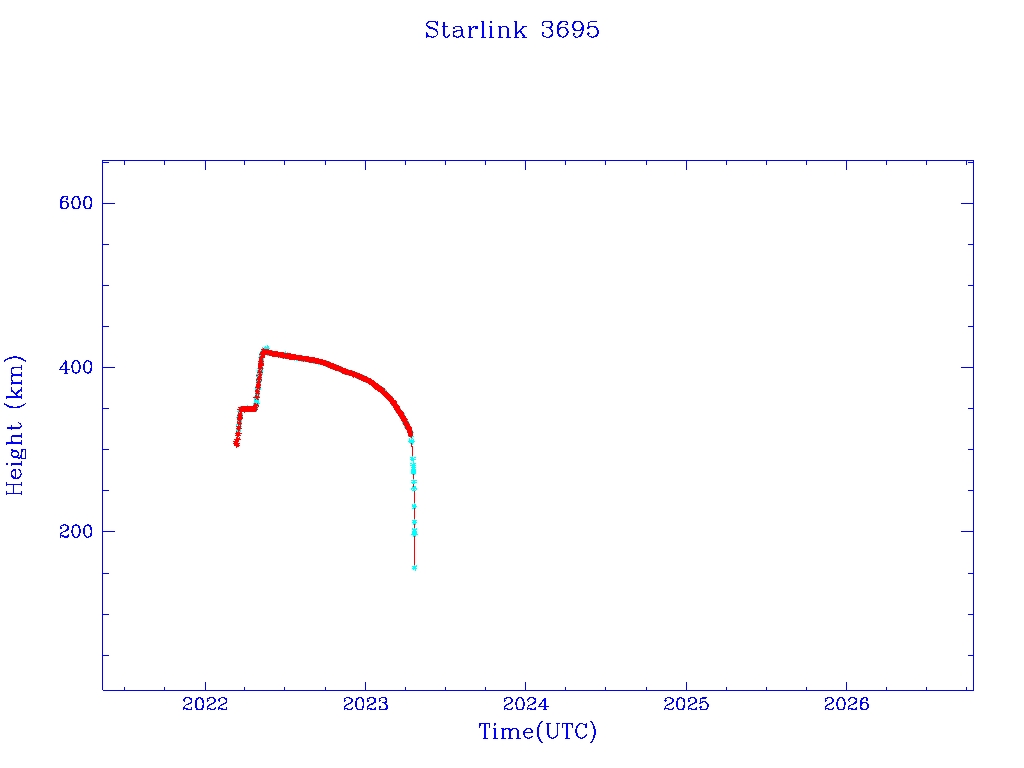 | Starlink 3695 | S51967 | M | 2022 Mar 9 | 2022 May 21 | 2023 Apr 21 |  |  |  |