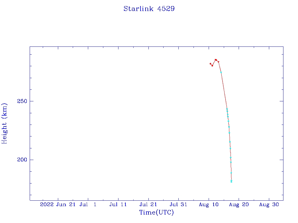 | Starlink 4529 | S53437 | F | 2022 Aug 10 | 2022 Aug 13? | 2022 Aug 17 |  |  |  |