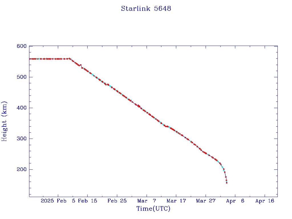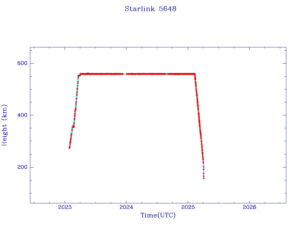 | Starlink 5648 | S55363 | R | 2023 Jan 26 | 2025 Mar 27? | 2025 Apr 3 |  |  |  |