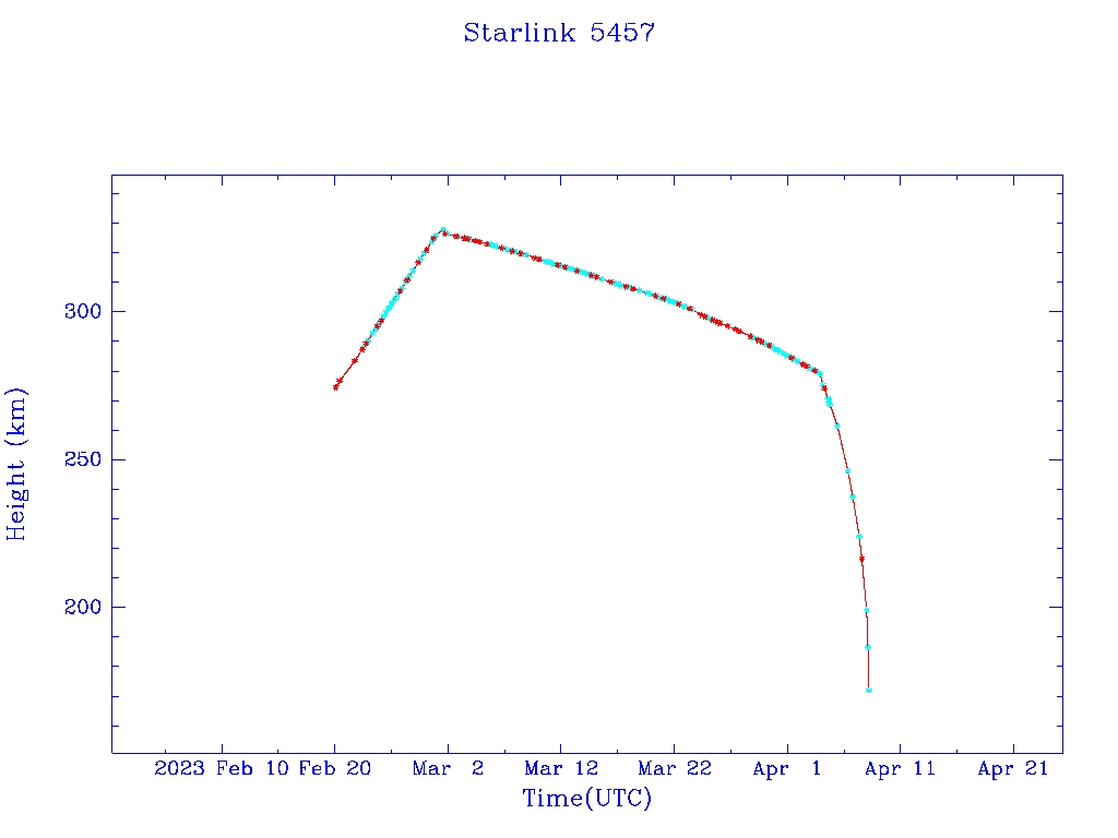 | Starlink 5457 | S55666 | F | 2023 Feb 17 | 2023 Apr 4 | 2023 Apr 8 |  |  |  |