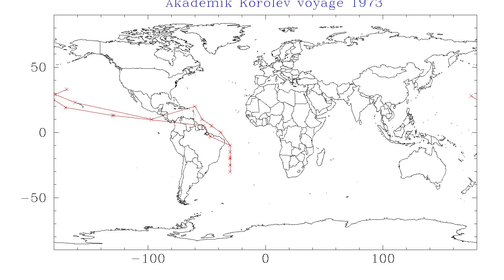 | 1973 Aug 23 0300:00 | M-100 | - | - | KORO | Akademik Korolev | GMS73D | LP8 | - | - | 30.0W 20.0S (+/- 5.0) | 89.0 |