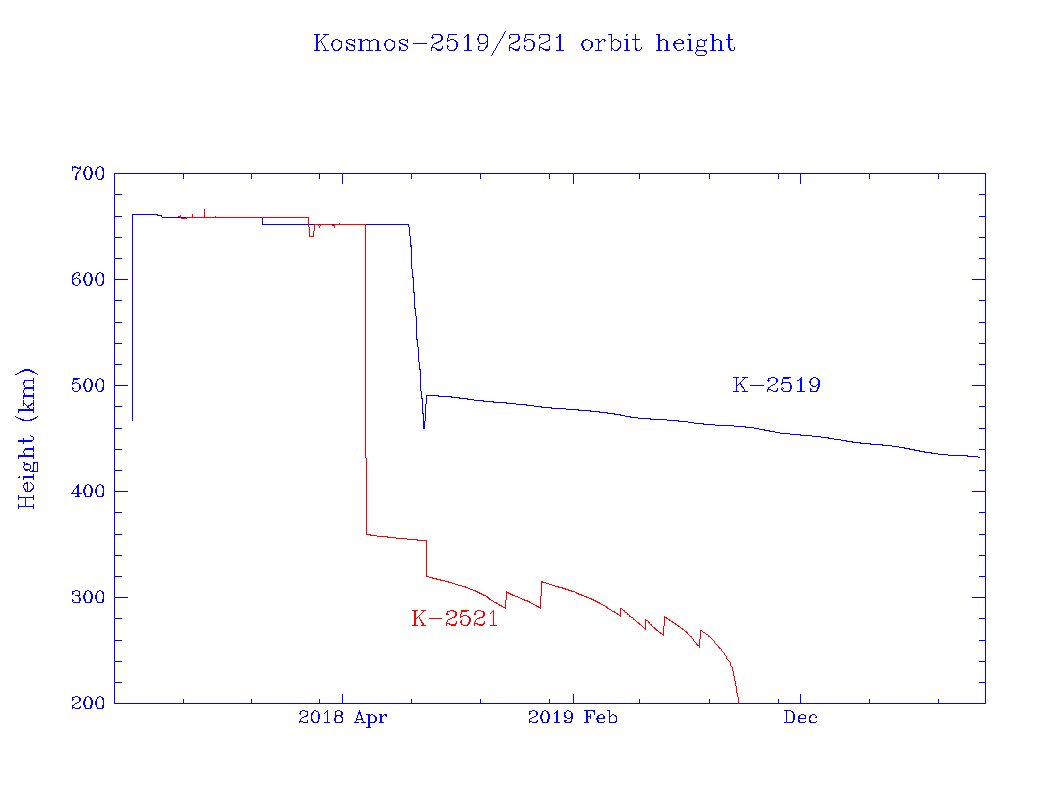 | Launch 2 | 2019 Jul 10 | Kosmos-2535 | 44421 | Unknown? | 2019 Aug-Sep? | Debris released | |